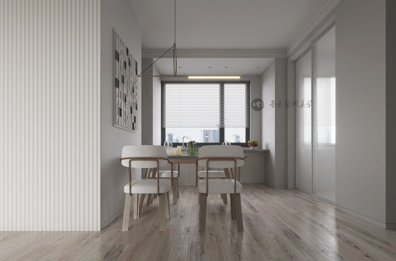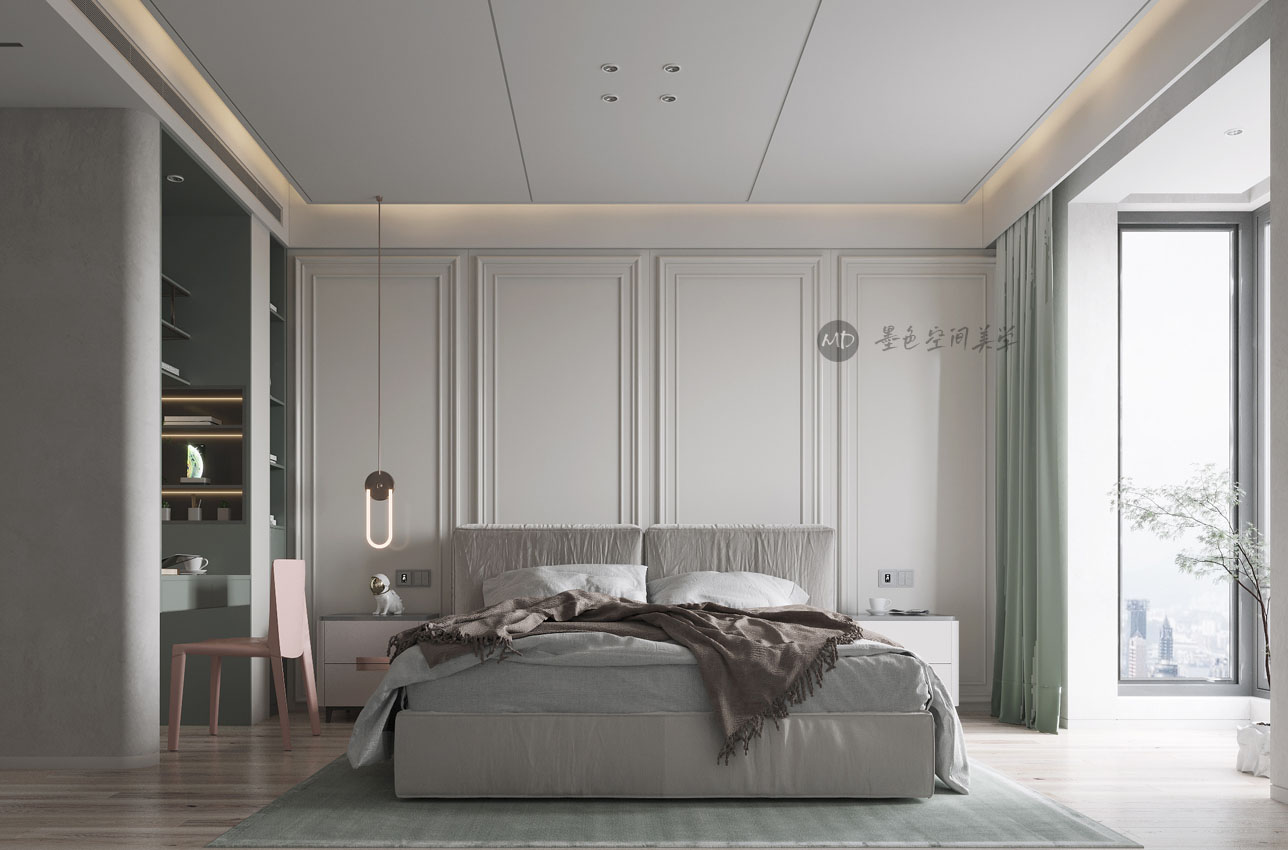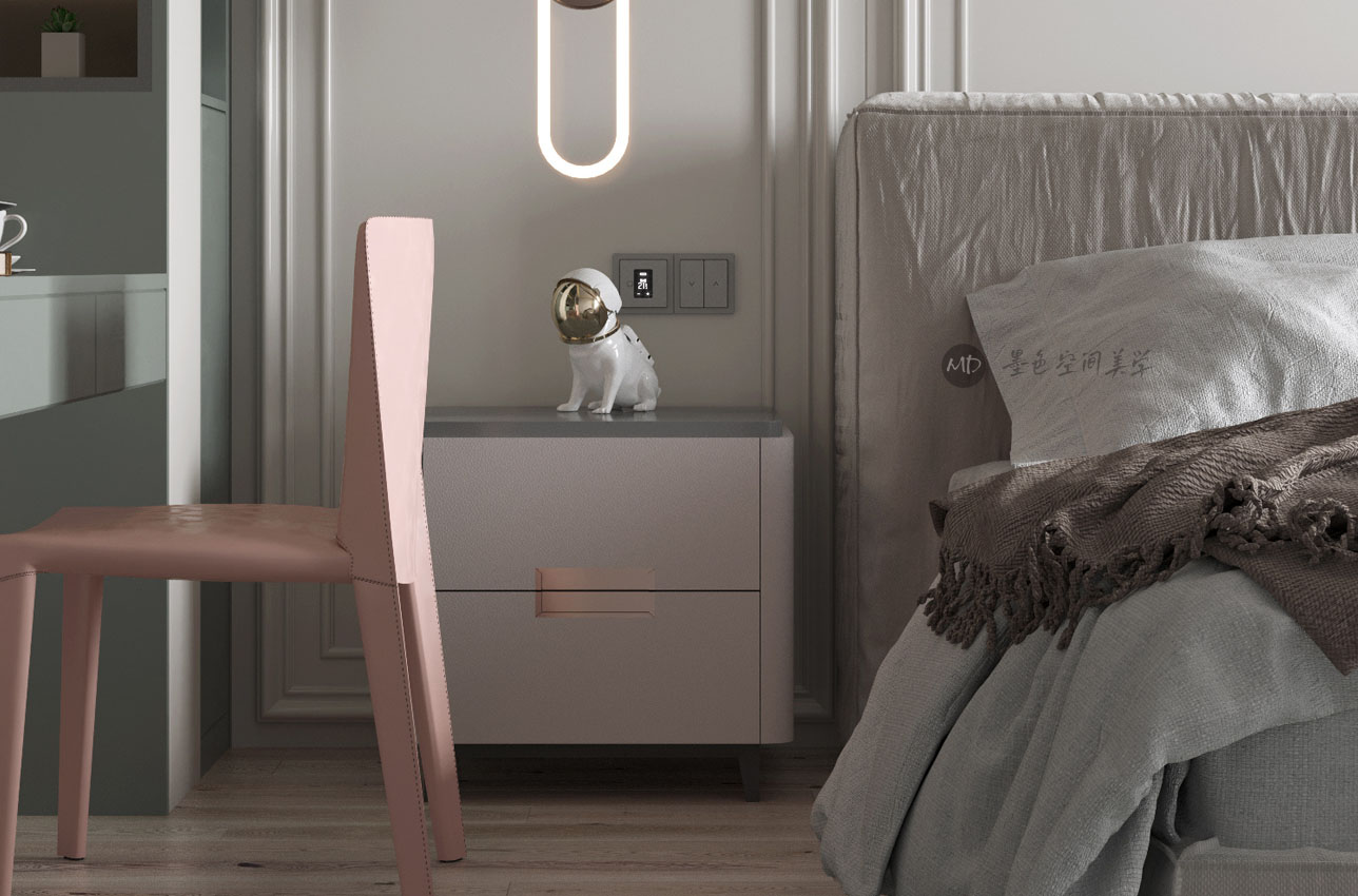 :业主喜欢北欧的线条感,又喜欢颜色干净利落,不喜欢重色调,在卧室要考虑办公的区域。