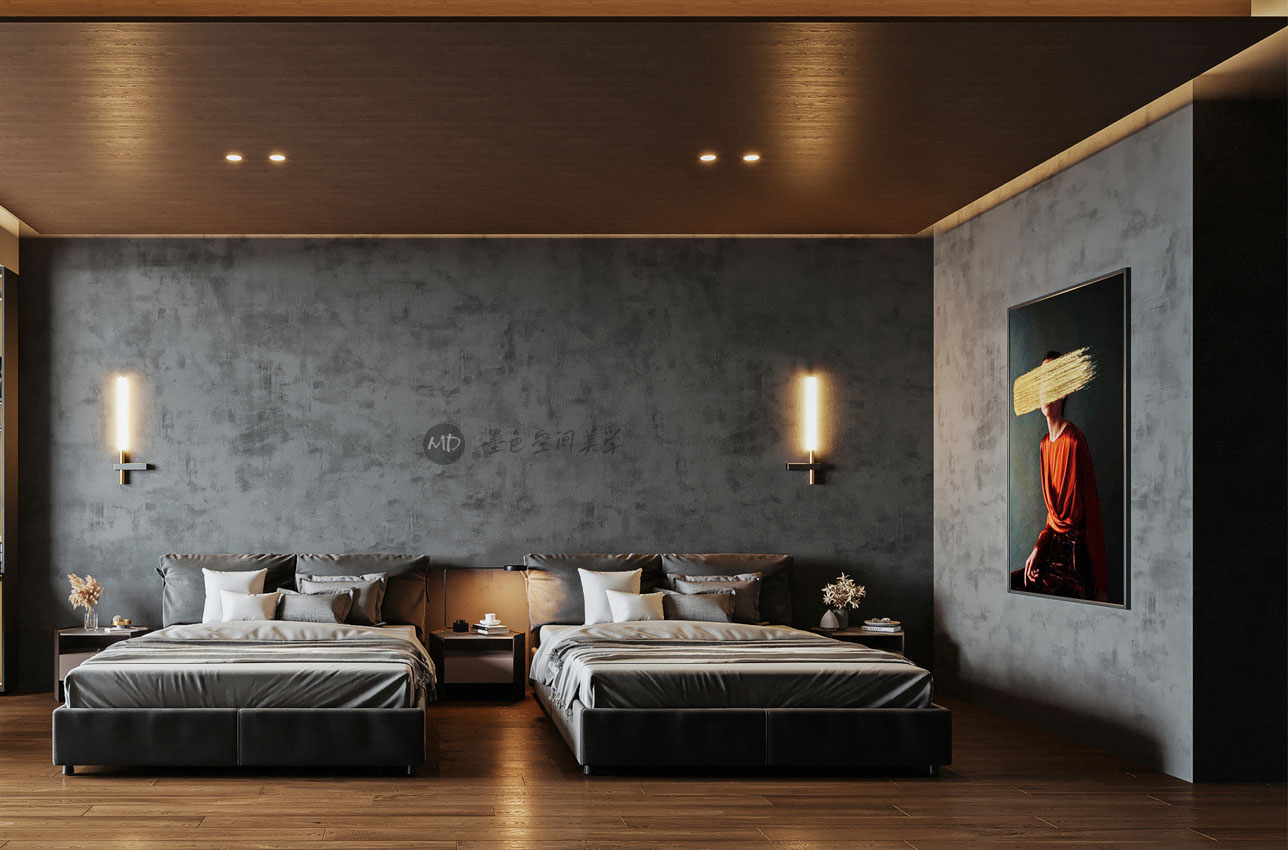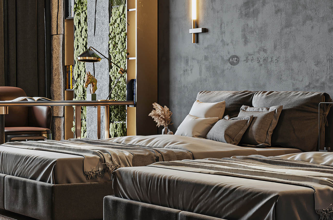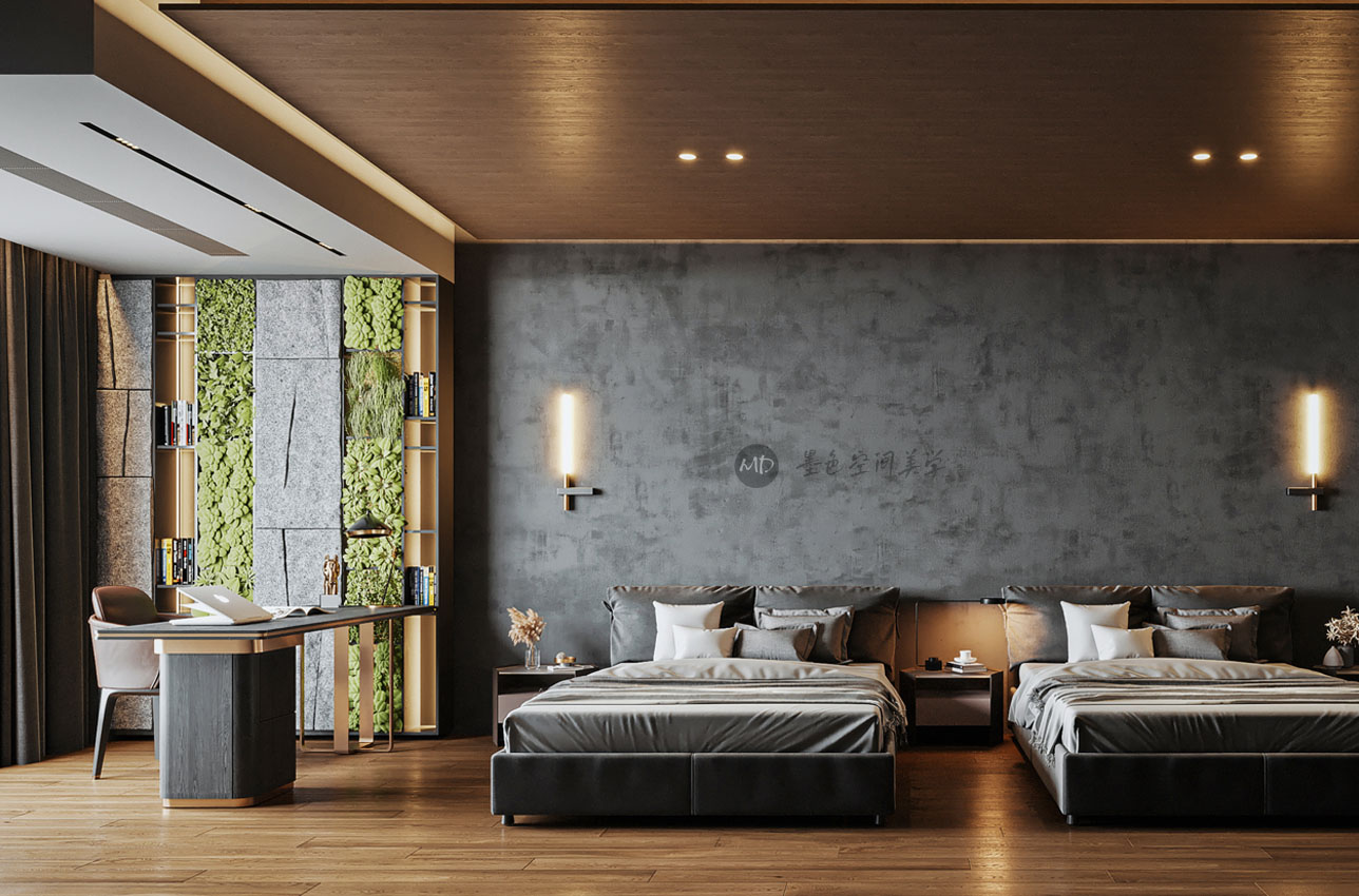 :业主希望客厅属于新中式的感觉,卧室可以极简一点,并且业主有个特别的情况,希望主卧跟另一个次卧打通,做标间,并希望是大床,他们夫妻不喜欢同床休息。
